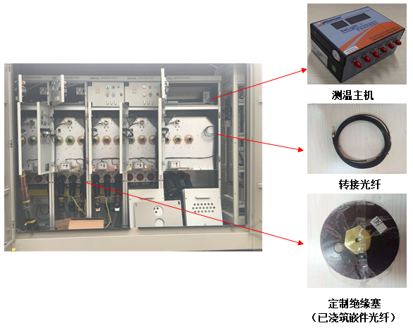 如圖所示,環(huán)網(wǎng)柜熒光光纖測溫系統(tǒng)由測溫主機、轉(zhuǎn)接光纖、定制絕緣塞(通過特殊工藝定制,澆筑嵌件光纖), 可替換原有絕緣塞,安裝方便,嵌件光纖更接近發(fā)熱點,測溫更準確。