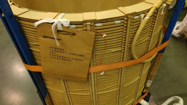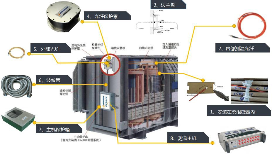 如圖所示,油浸式變壓器熒光光纖測(cè)溫系統(tǒng)由內(nèi)部光纖、法蘭盤、外部光纖、測(cè)溫主機(jī)組成,內(nèi)部光纖根據(jù)設(shè)計(jì)需求布置于繞組線圈、鐵芯、油面等部位,通過法蘭盤上的貫通器與外部光纖連接,光信號(hào)通過光纖傳導(dǎo)至測(cè)溫主機(jī)解析出測(cè)點(diǎn)溫度。