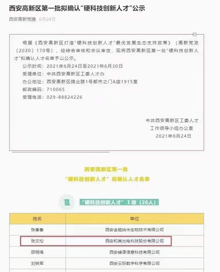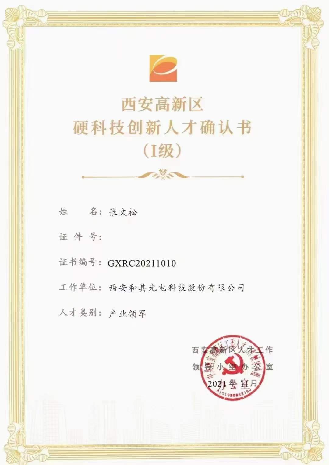 和其光電董事長張文松獲得西安市高新區(qū)硬科技創(chuàng)新Ⅰ級人才。該認定參照國家“高層次人才特殊支持計劃”杰出人才標準,是對和其光電和人才的極大支持與鼓勵。