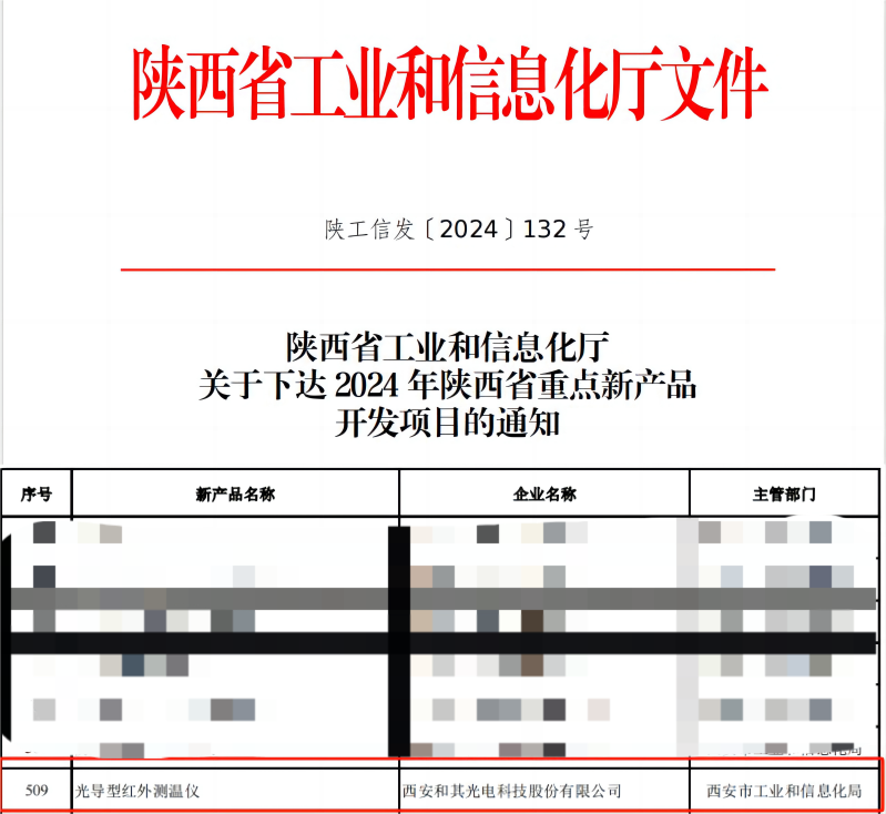 近日,陜西省工信廳公布了2024年陜西省重點新產(chǎn)品開發(fā)項目名錄,和其光電“光導型紅外測溫儀”入選新產(chǎn)品開發(fā)項目名單。