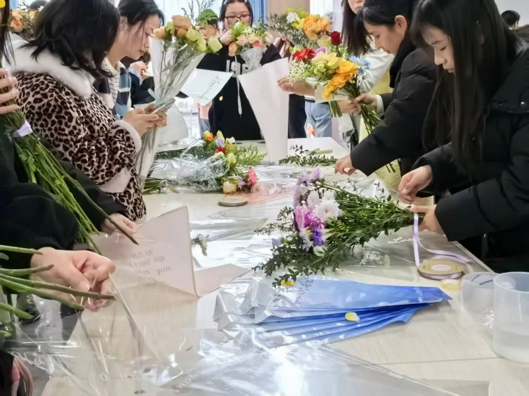 指尖生花處,春意滿人間。大家用自己的巧手修剪枝葉,巧妙的搭配花材,經過一番雕琢,一件件風格多樣、獨具韻味的插花作品漸次成型,或堅韌、或溫婉、或熱情,展現(xiàn)了新時代女性對生活的熱愛、對美的追求?;顒蝇F(xiàn)場花香四溢,歡聲笑語不斷,大家盡情享受著插花藝術帶來的樂趣,感受著春天的氣息和生命的活力。
