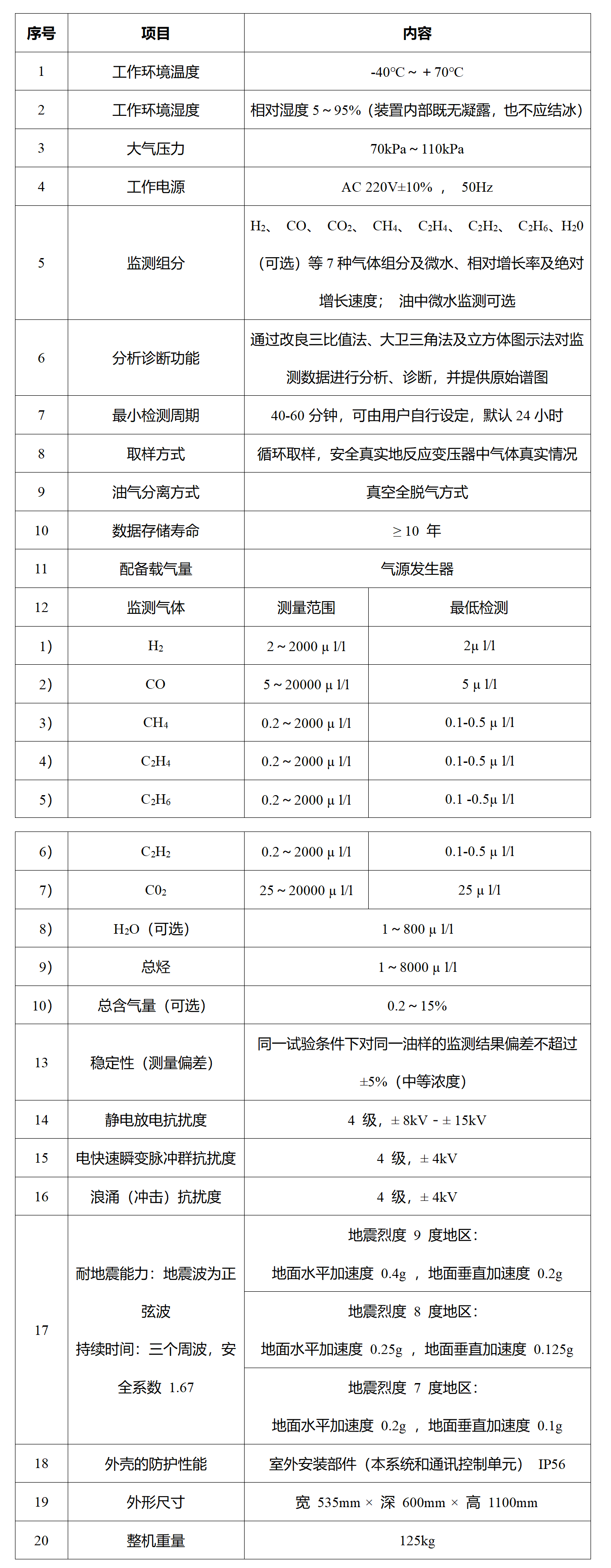 4) 測量種類:H2,CO,CO2,CH4,C2H4,C2H6,C2H2和微水;